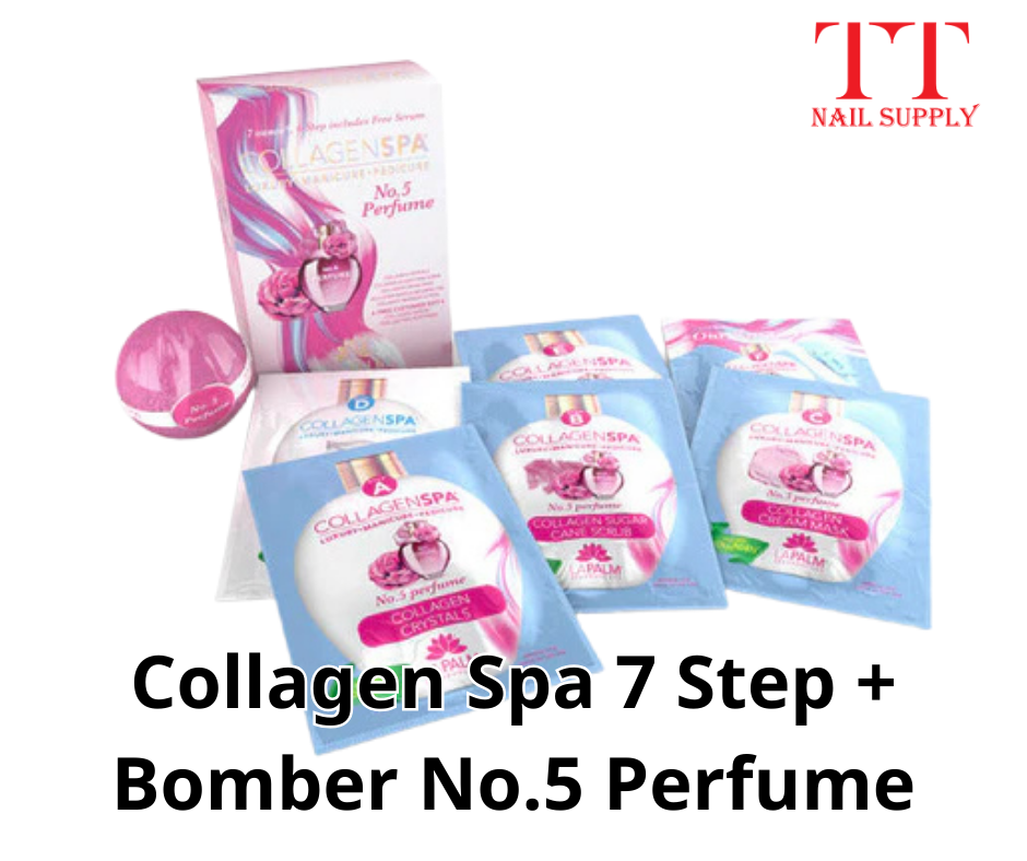 Collagen Spa 7 Step + Bomber (No. 5 Perfume), 60 kits per case is a premium manicure and pedicure spa system designed for professional salons. It includes seven sequential steps plus a collagen-infused Bomber, delivering a luxurious spa experience.