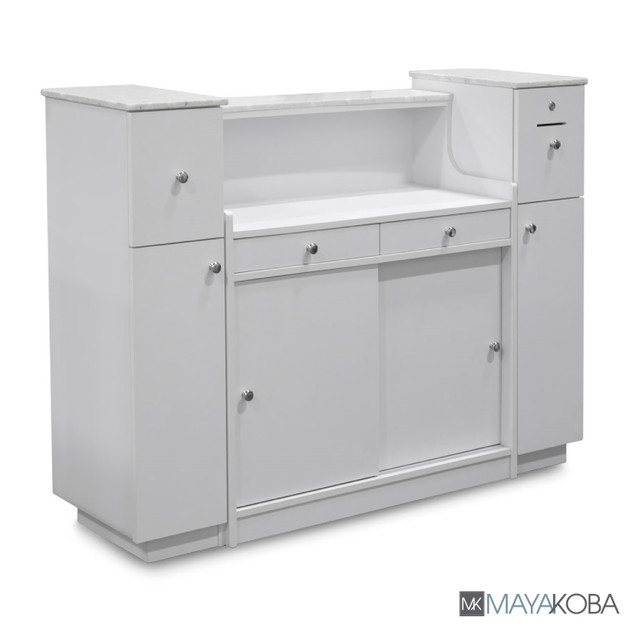 Chiếc bàn tiếp tân “Sonoma” tuyệt đẹp, với biển hiệu, chắc chắn cho thấy rằng bạn có một salon sang trọng ngay khi bước vào! Đá granite trắng ngà, với nhiều tông màu be và xám, cùng với các chi tiết nhôm brushed tạo nên vẻ thanh lịch với màu trắng nổi bật của bàn. Mặt kính ở phía trước, với khung và 2 kệ kính điều chỉnh, cho phép bạn trưng bày những sản phẩm tốt nhất của mình.