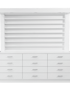 Tủ trưng bày sơn một bên này không chỉ giới thiệu bộ sưu tập sơn và bột đầy màu sắc của salon mà còn được thiết kế tỉ mỉ với nhiều ngăn kéo có vách ngăn giữ các vật dụng hàng ngày an toàn và khuất tầm nhìn.
